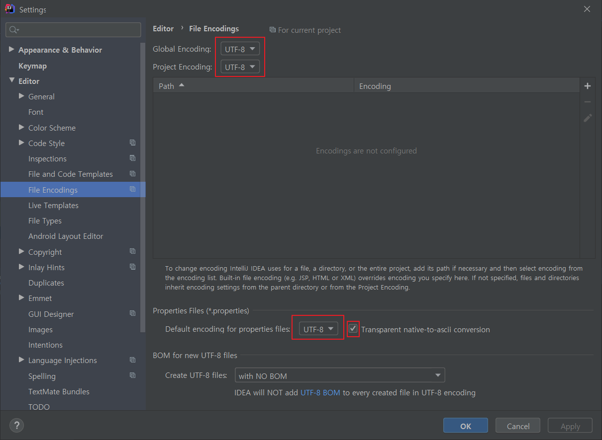 IDE 메뉴에서 File>Settings...을 누르고, 검색란에 'File Encodings'를 찾아서 들어가면 Encoding option들을 볼 수 있다.