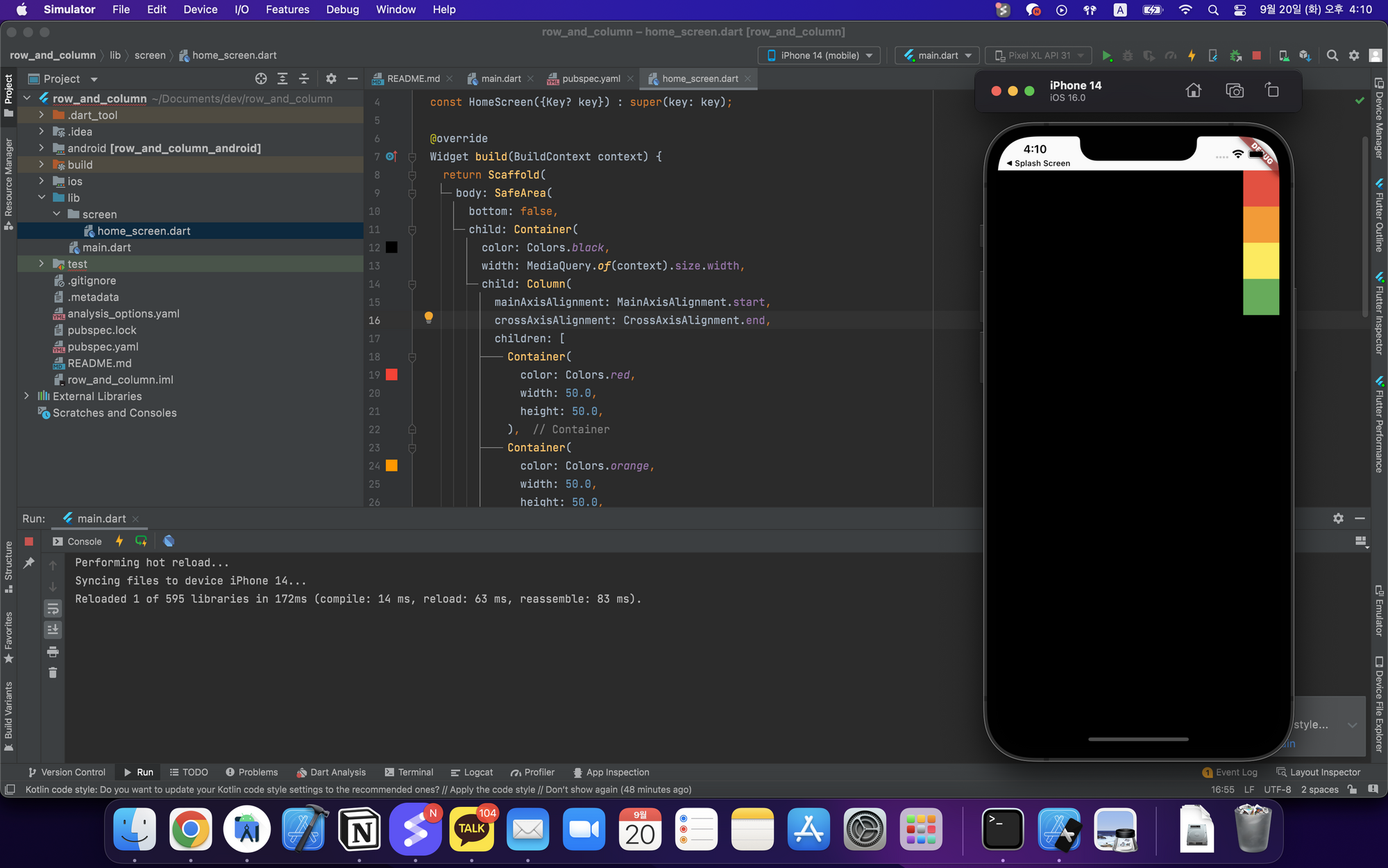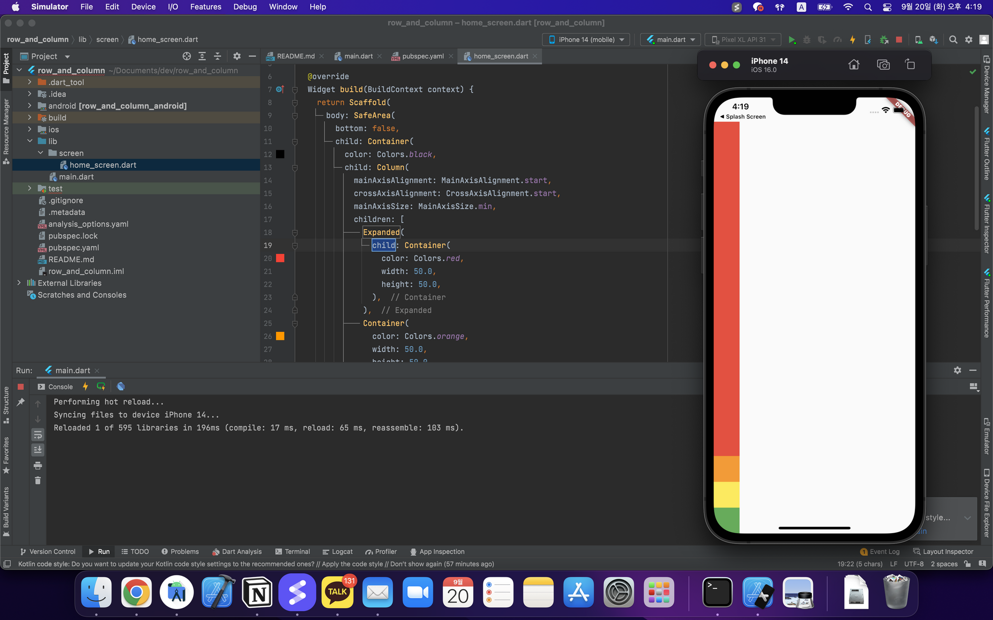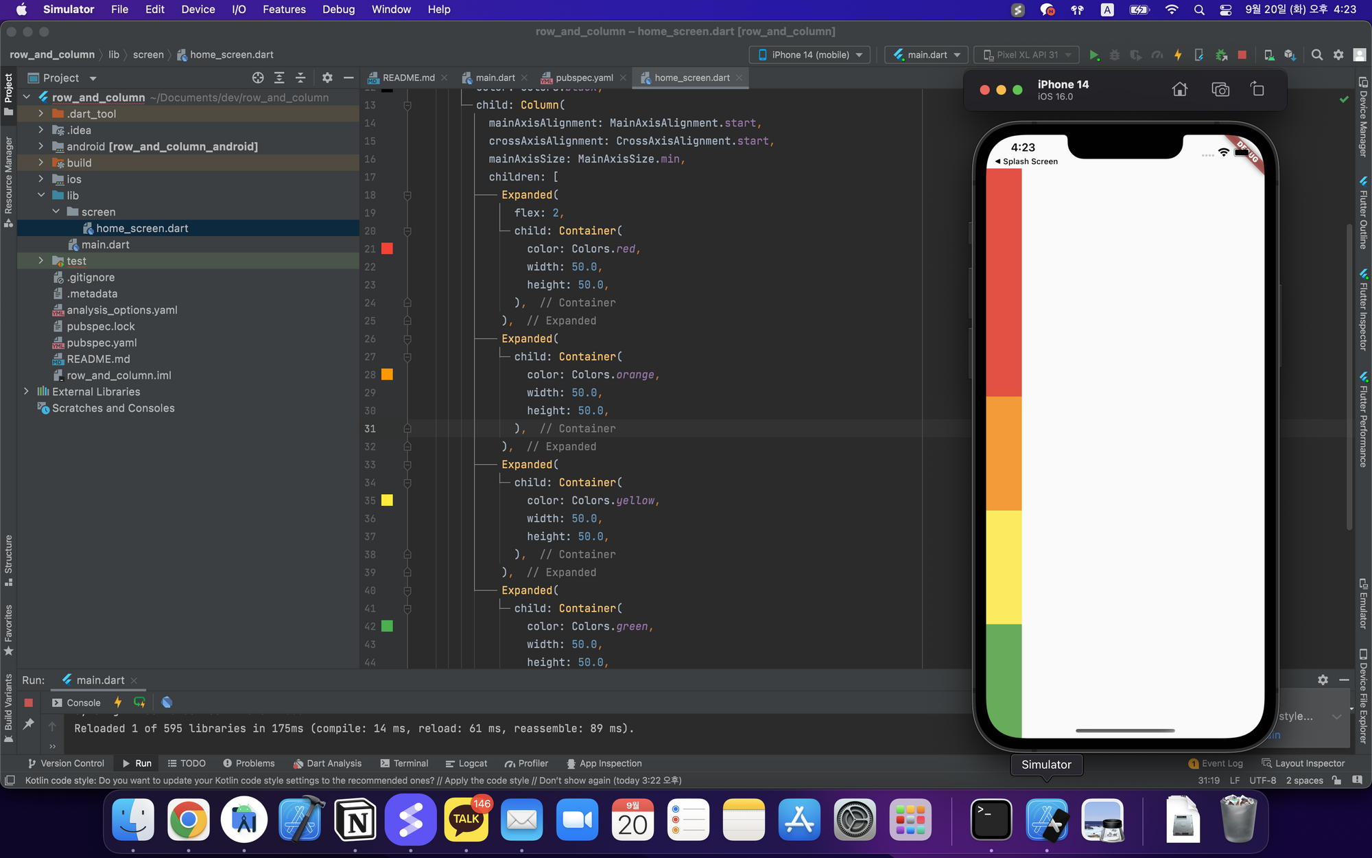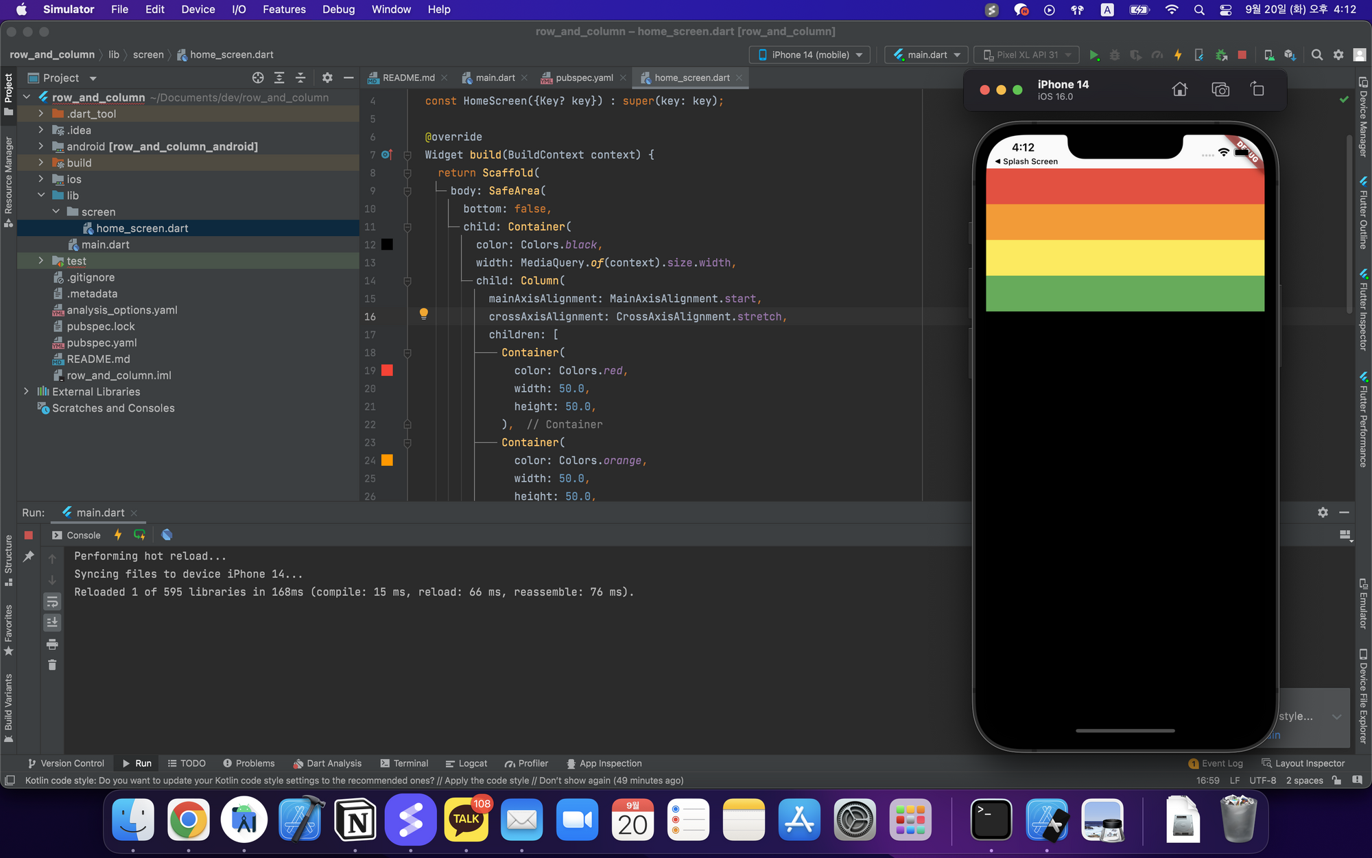 말 그대로 수평으로 위젯들을 나열해야할 때는 Row wiget을 사용하고, 수직으로 나열해야할 때는 Column widget을 사용한다.