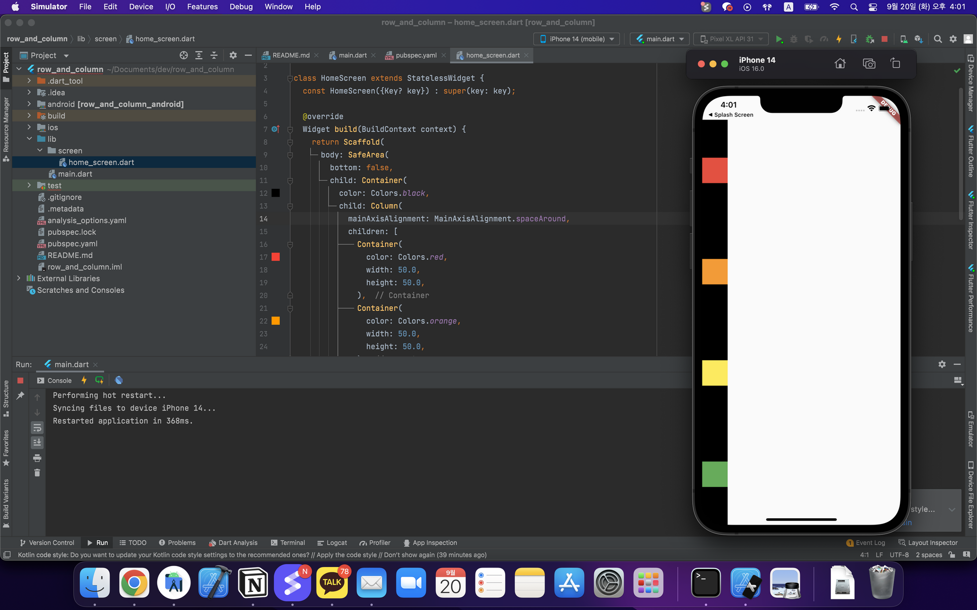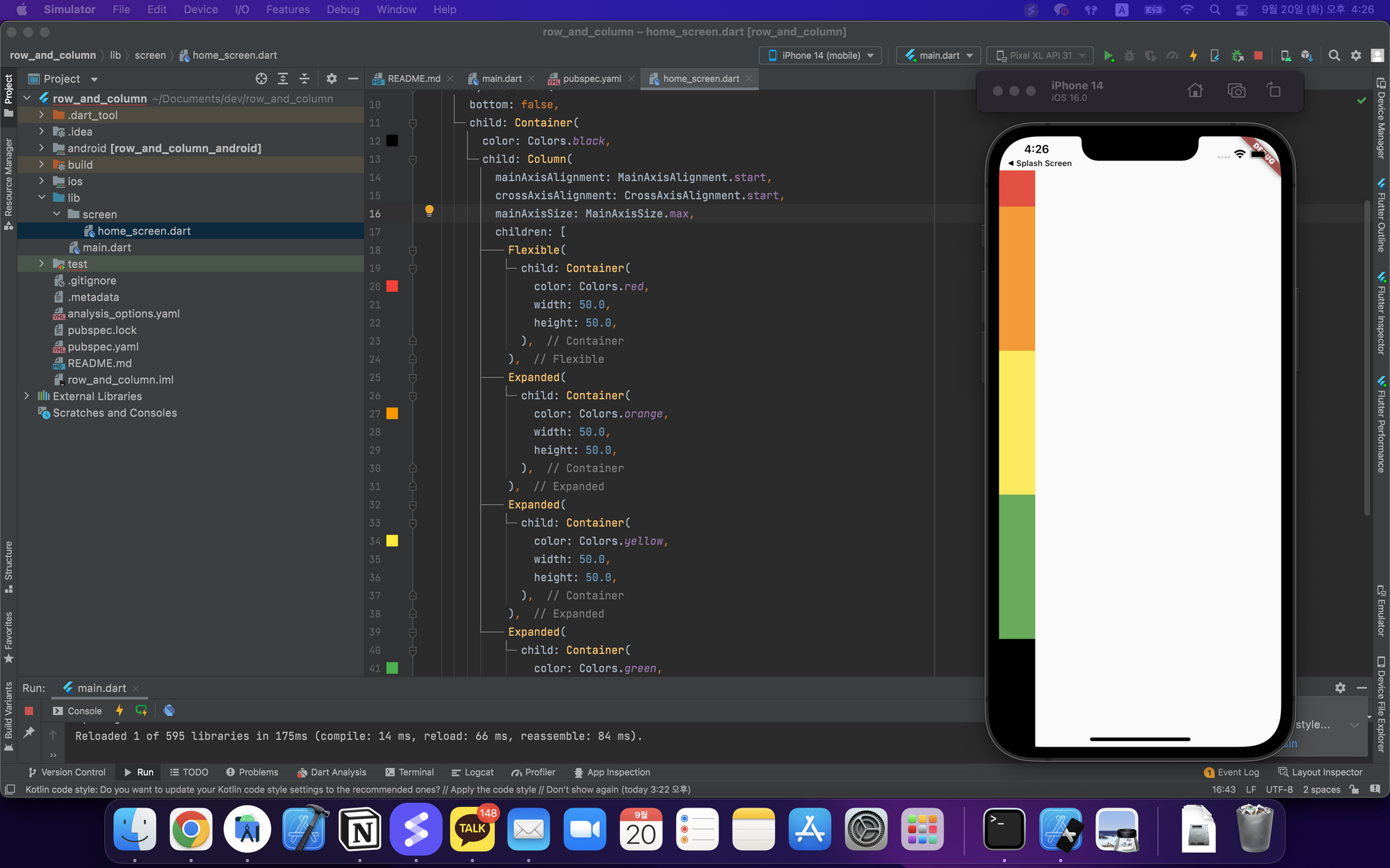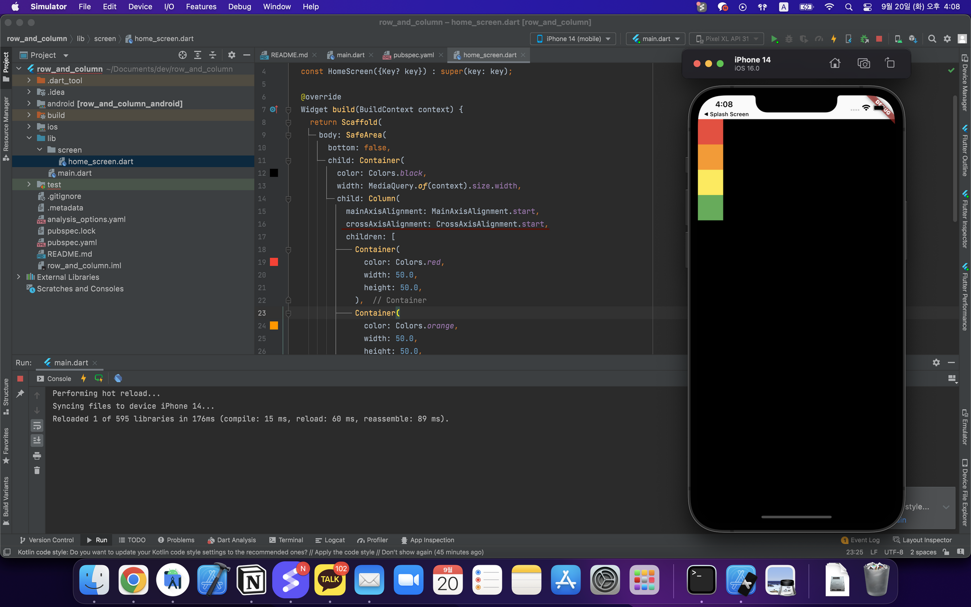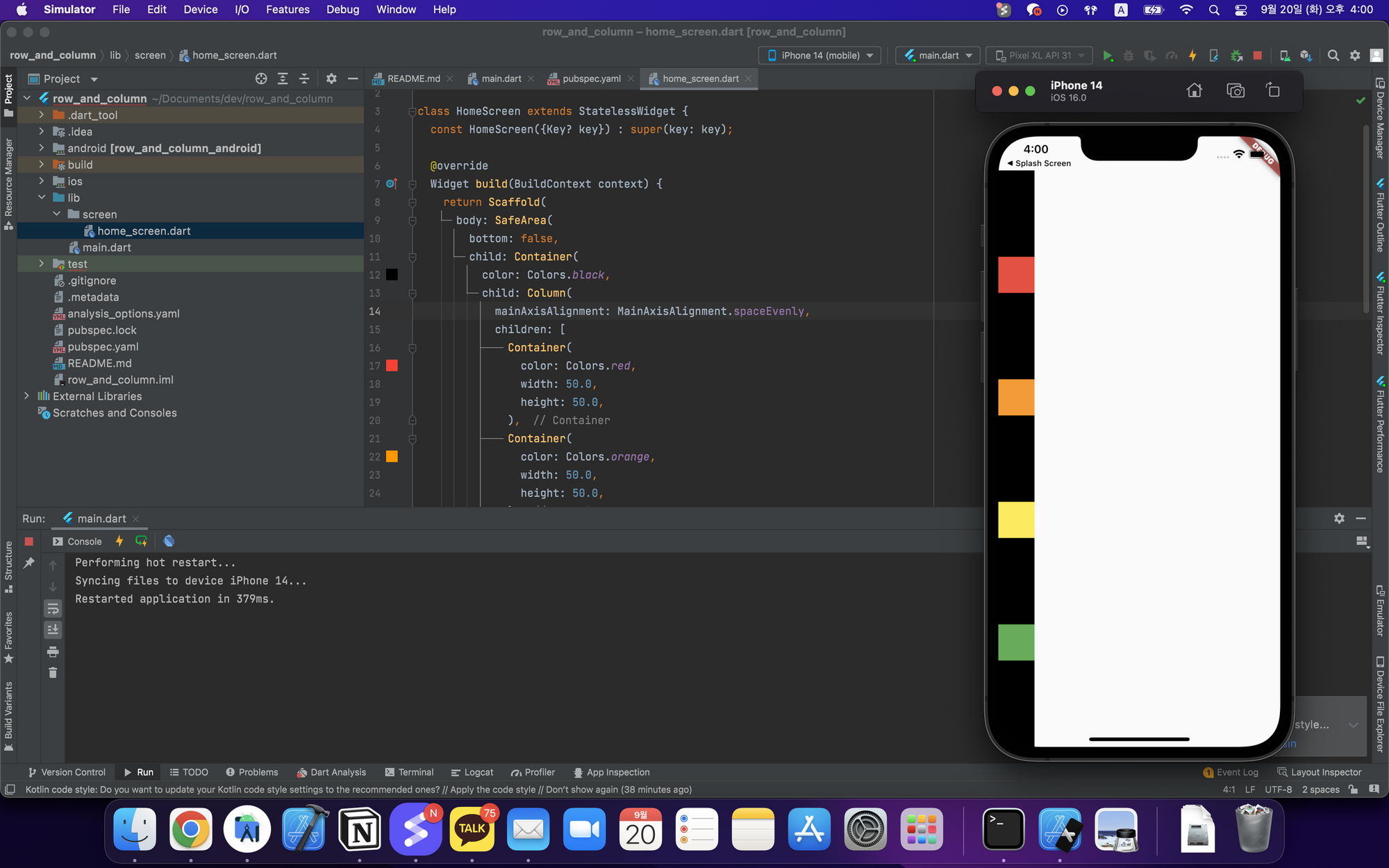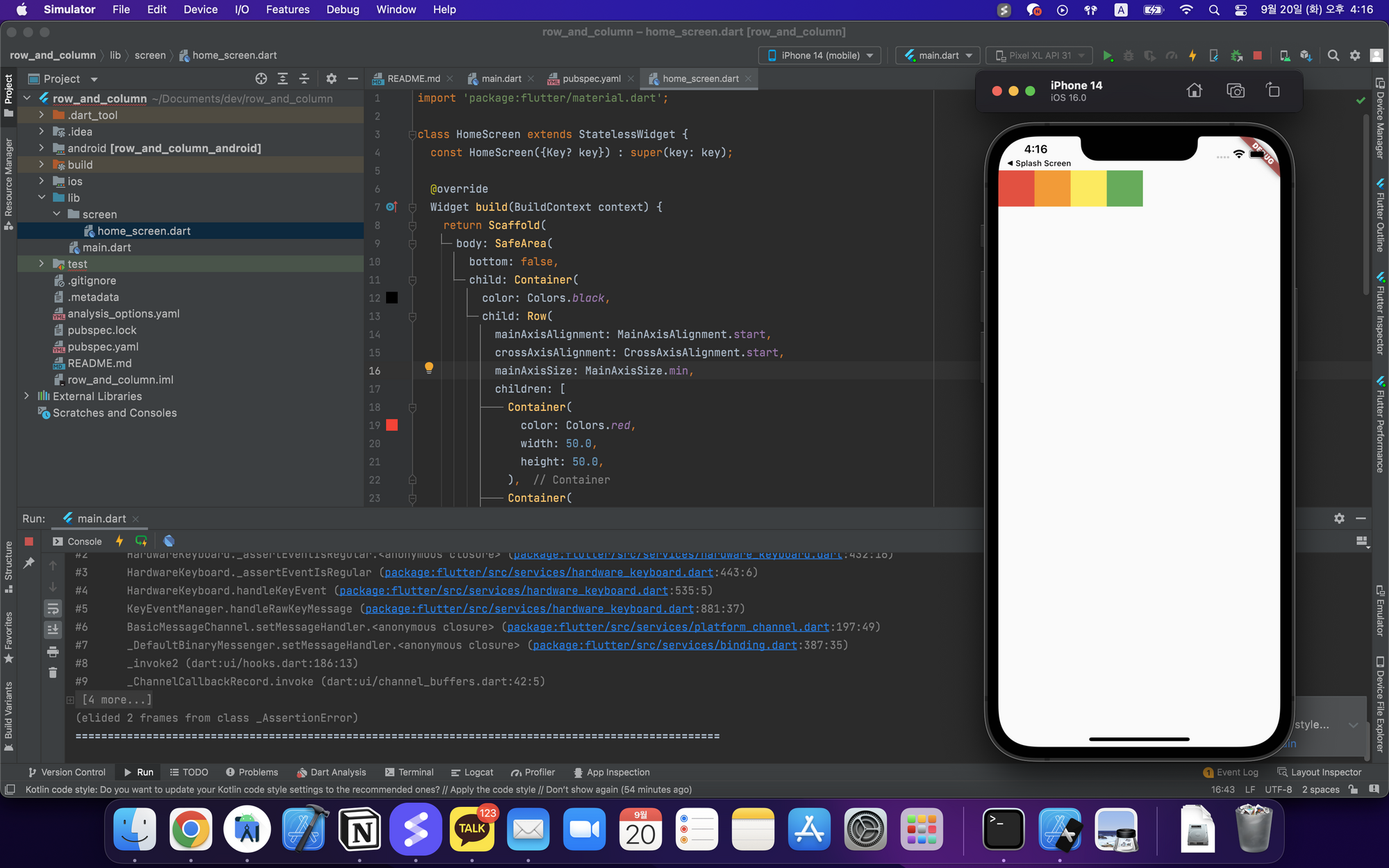 말 그대로 수평으로 위젯들을 나열해야할 때는 Row wiget을 사용하고, 수직으로 나열해야할 때는 Column widget을 사용한다.